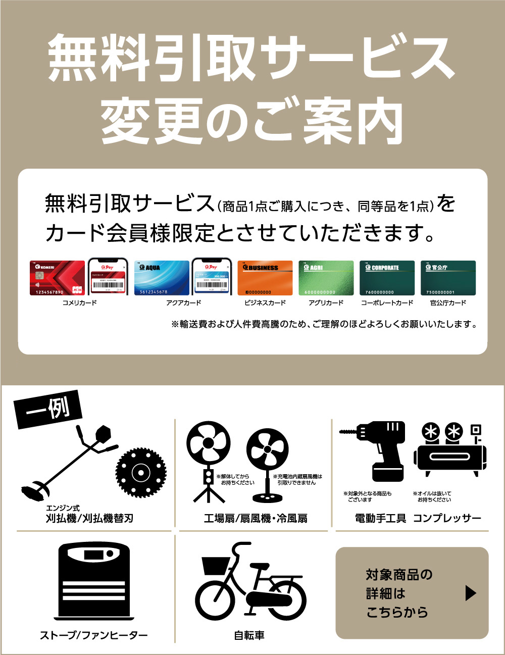 当店にて商品1台ご購入につき、ご家庭で不要となった同等品を1台、コメリ店舗にお持ちいただいた場合に、無料でお引き取りいたします。